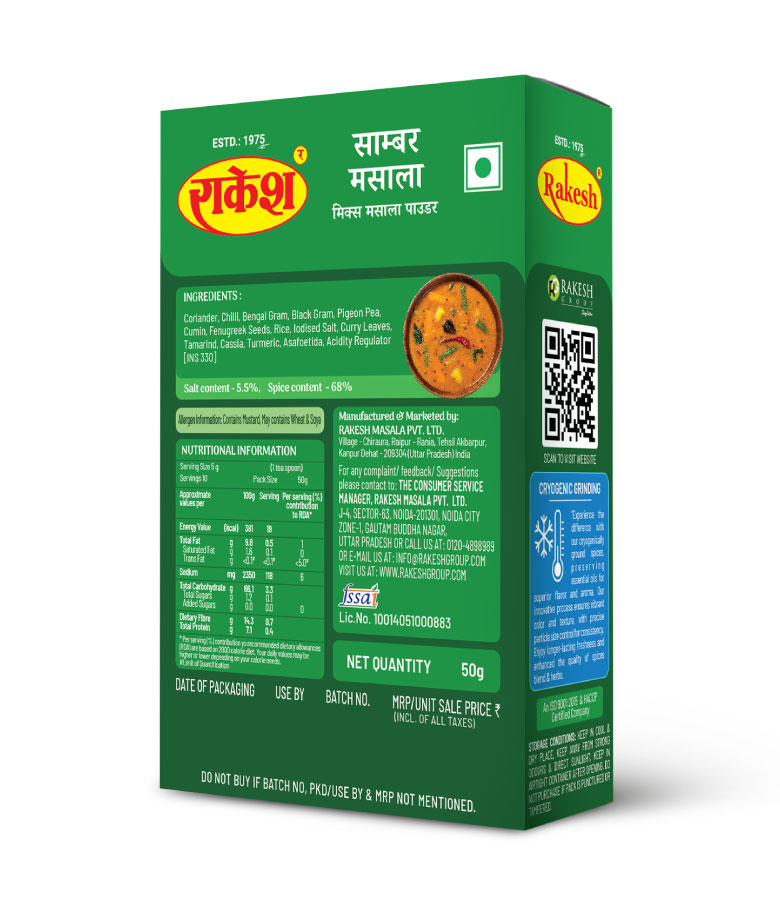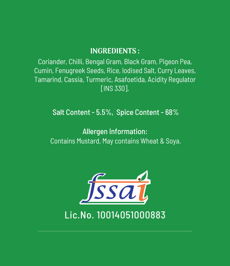 Coriander, Chilli, Bengal Gram, Black Gram, Pigeon Pea, Cumin, Fenugreek Seeds, Seeds, Rice, Iodised Salt, Curry Leaves, Tamarind, Cassia, Turmeric, Asafoetida, Acidity Regulator [INS 330]